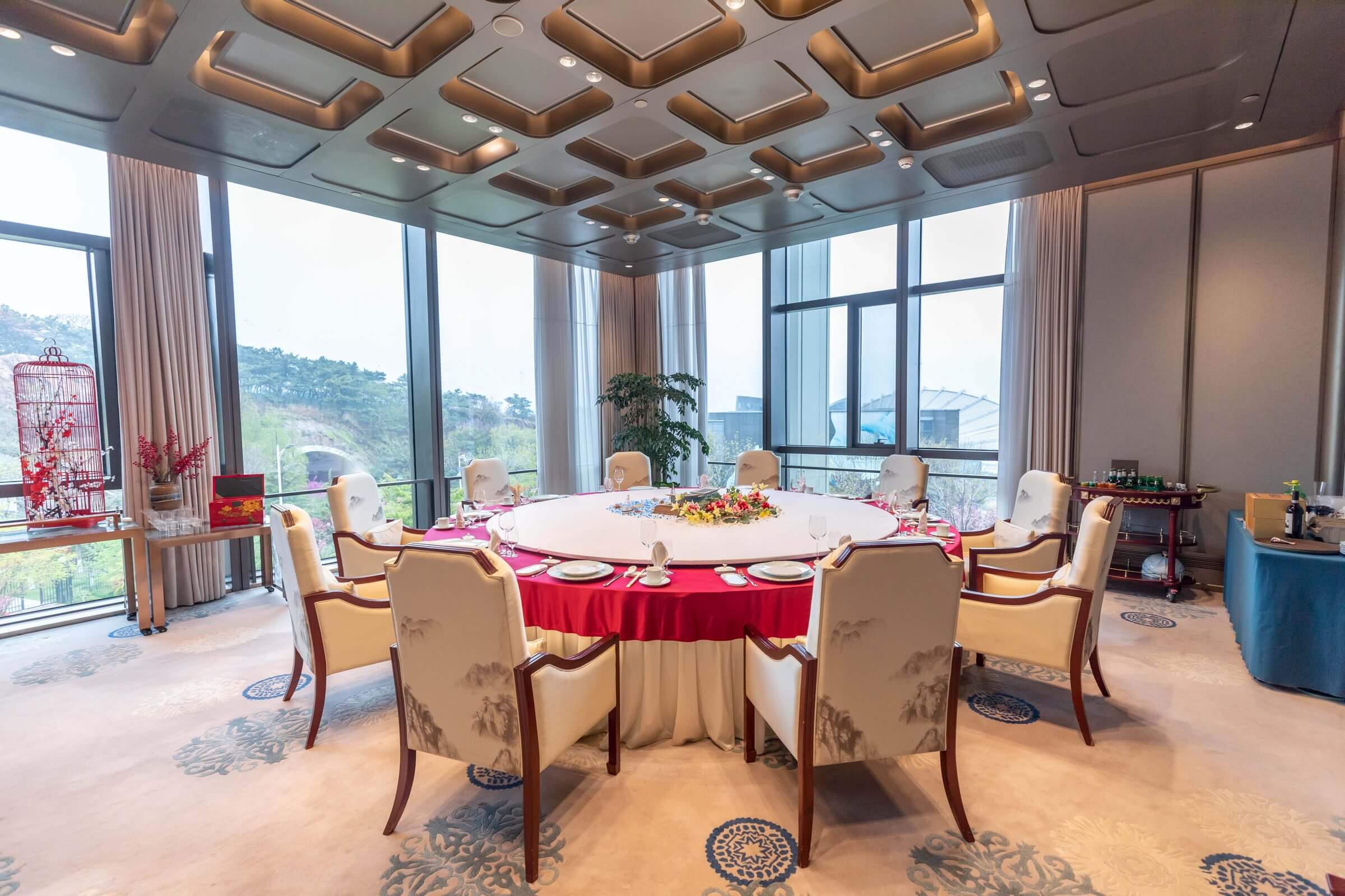 海云轩中餐厅可承接6至30人的高档私宴,以及4至65桌不同规格的寿宴、宝宝宴、商务宴请等宴会活动。“因海而生、向海而兴”,将创新智慧注入地道食材,用鲁味传承唤醒沉睡味蕾,在山、海、城、帆融合的灵动意境中,为食客带来“山海灵气,齐鲁风韵”的饕餮盛宴。